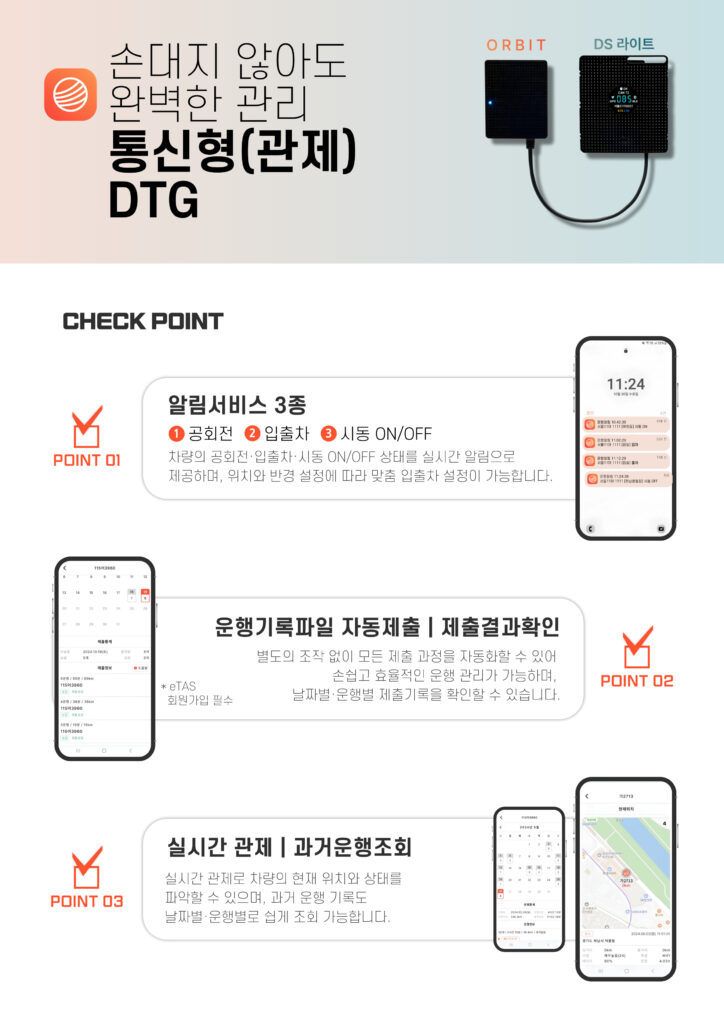 DTG는 차량의 운행기록을 실시간으로 수집하고 저장하는 운행기록계입니다.그 중 보급형 DTG는 별도의 통신비 없이 핸드폰 앱과 블루투스를 통해운행기록 파일을 eTAS에 자동으로 전송해줍니다.